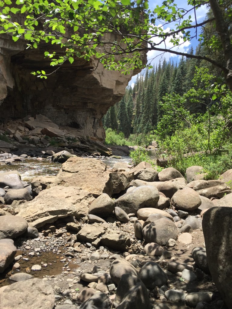 We enjoyed exploring the hidden places under the steep rock walls and watching chipmunks race around the banks. A sliver of sky shone through the trees and rocky faces. Soon we noticed clouds rolling in for the customary afternoon showers. We decided to head back out of the river and seek shelter in our car parked quite a distance away.